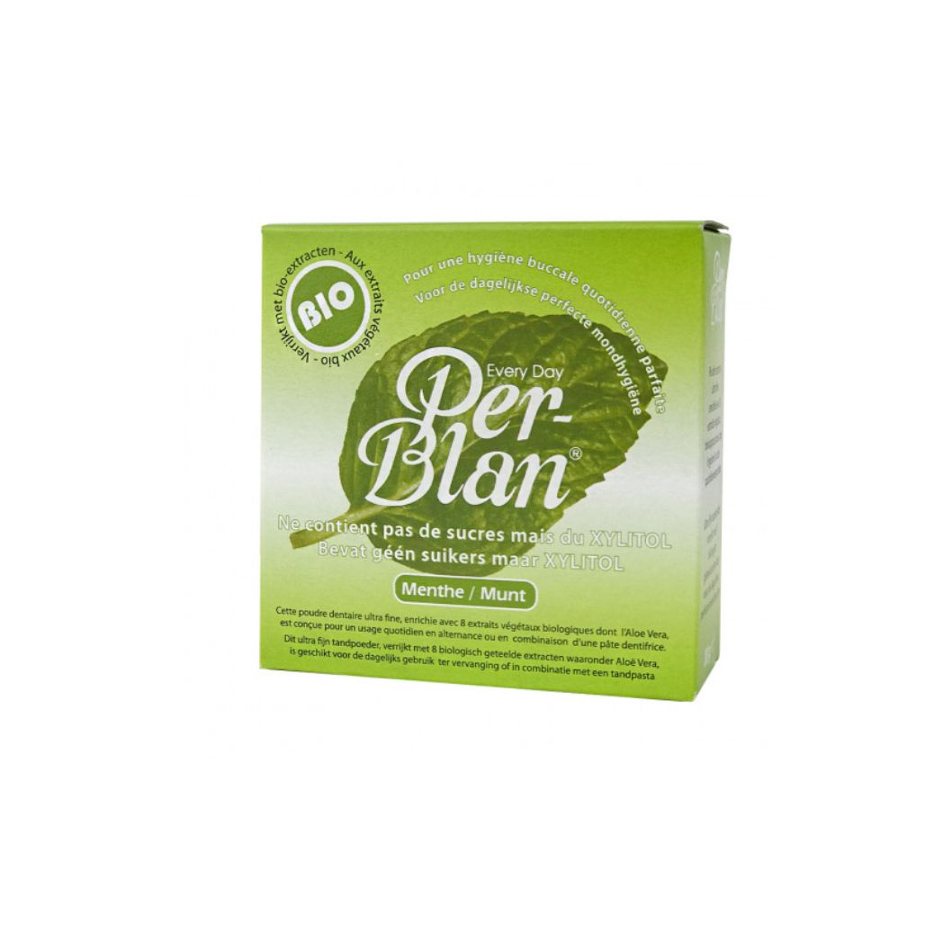 PerBlan Poudre dentaire ultra fine à la menthe enrichie avec 8 extraits végétaux. Excellent dentifrice pour les fumeurs ou blanchir les dents et sans fluor!